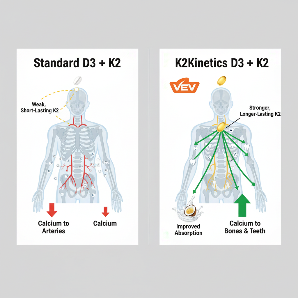 Most K2 lasts only 6 hours at weak doses (45mcg vs. 180mcg needed). Without enough K2, calcium clogs arteries instead of building bones. We use better K2 that lasts 3 days at proven doses, plus coconut oil so it actually absorbs.